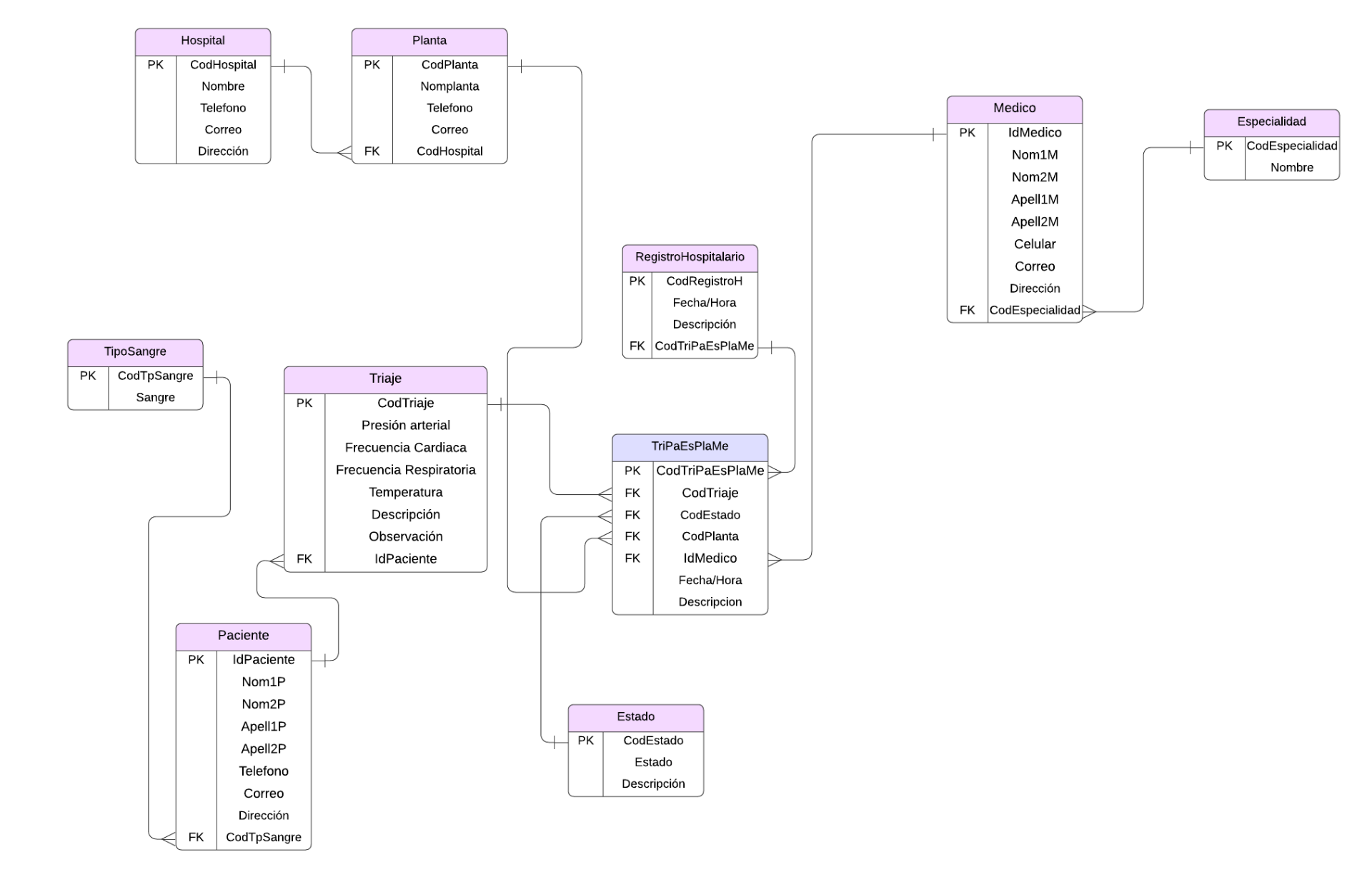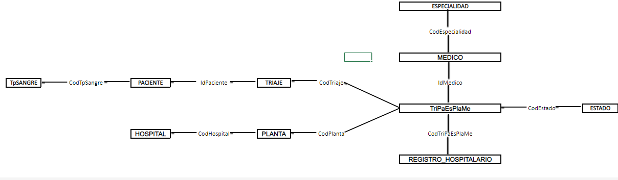 Realizar el diseño e implementación de una base de datos que guarde información de los pacientes que ingresan en un hospital. En este hospital, los pacientes que llegan al servicio de urgencias del hospital son examinados y, dependiendo de su estado de salud, son ingresados en la planta correspondiente (traumatología, cuidados intensivos, ...) bajo la supervisión de un médico responsable: