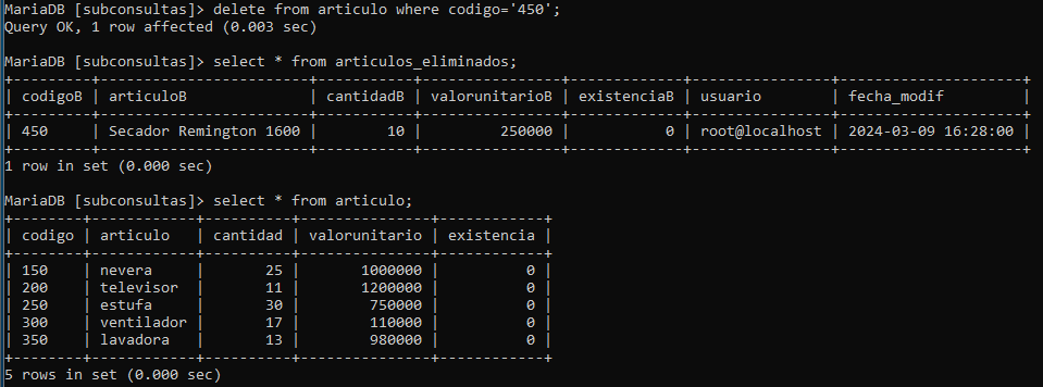 Probamos el trigger de eliminar y guardar el articulo eliminado