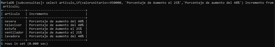 2.Consultar los Artículos que tienen un precio menor o igual a 950000, y sacar un mensaje que diga Porcentaje de Aumento el 25%, de lo contrario debe salir un mensaje que diga Porcentaje de aumento del 40%, con el Alias de Incremento.