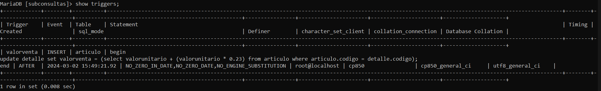 Se observa el trigger con el comando SHOW TRIGGERS;