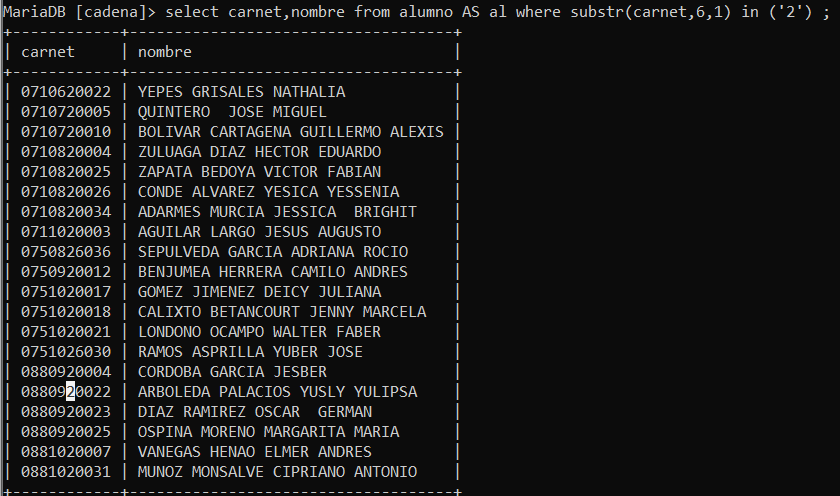-Carnet mayor de los alumnos que aparecen en el sistemas (sin incluir carrera, año de matricula, ni semestre, solo los ultimos 4 digitos)